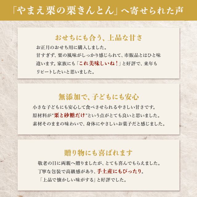 熊本県山江村特産の「やまえ栗」を100%使用した、やまえ堂の栗きんとん。原材料は栗と砂糖、塩のみというシンプルさで、無添加・無着色にこだわりました。栗そのものの自然な甘みと風味を引き出し、素朴ながらも贅沢な味わいをお楽しみいただけます。健康志向の方や小さなお子さまからご年配の方まで安心して召し上がれる和菓子です。日常のおやつやティータイムのお供にはもちろん、手土産やお取り寄せスイーツ、内祝い・プチギフトにも最適です。