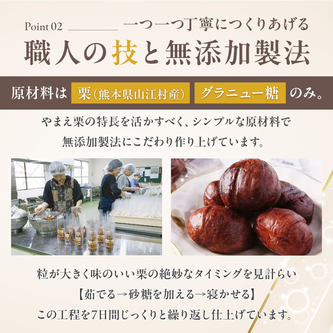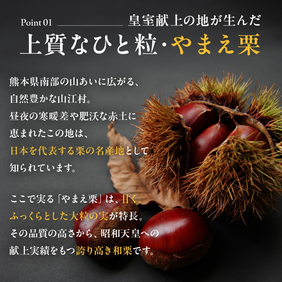 熊本県山江村の特産「やまえ栗」を使用した、やまえ堂の渋皮煮5粒入り。厳選された栗を丁寧に仕込み、栗本来の風味を活かしながら、上品な甘さと渋皮特有の旨みを引き出しました。無添加・無着色で仕上げているため、安心してお召し上がりいただけます。健康志向の方や自然派スイーツを好む方にもぴったり。日常のおやつはもちろん、手土産や内祝い、プチギフトとしても喜ばれる逸品です。