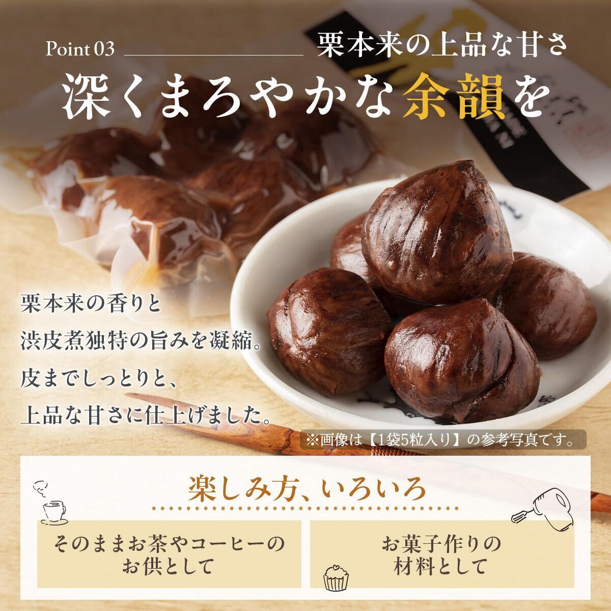 熊本県産の大粒な栗をじっくり丁寧に煮上げたのが本品「栗渋皮煮」です。選りすぐりの大粒栗のみを使用し、無添加・無着色にこだわることで、栗本来の香りと旨み、上品な甘さをそのまま楽しめる味わいに仕上げています。やわらかな食感と深みのある風味は、和菓子としてはもちろん、コーヒーや日本茶との相性も抜群です。