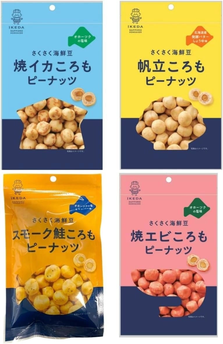 北海道の老舗「池田食品」が手掛ける人気シリーズ「さくさく海鮮豆」の味わいを一度に楽しめる、4種食べ比べセットです。 薄皮付きピーナッツを香ばしい衣で包み、海鮮の旨味を活かした甘くない味付けが特長の創作豆。サクサクとした軽快な食感で、ナッツ好きの方や大人のおつまみにぴったりです。 帆立パウダーとバター醤油のコクが広がる「帆立ころも」、イカの香ばしさが際立つ「焼イカころも」、エビの濃厚な旨味が楽しめる「焼エビころも」、燻製の香りがクセになる「スモーク鮭ころも」。 それぞれ個性の異なる味わいで、最後まで飽きずに楽しめます。 ビール・日本酒・ハイボール・ウイスキーなどのお酒のお供としてはもちろん、日常のおやつやお取り寄せグルメ、家族や友人とのシェアにもおすすめ。 北海道の素材と老舗の技が生んだ、満足感のある海鮮ピーナッツスナックをぜひご堪能ください。