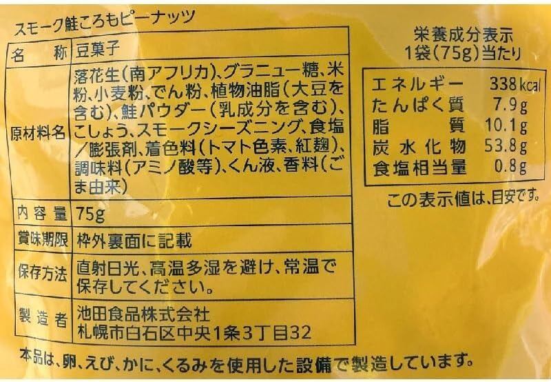 スモーク鮭ころもピーナッツ:落花生、ビートグラニュー糖、米粉(国産)、小麦粉、でん粉、植物油脂(大豆を含む)、鮭パウダー(乳を含む)、こしょう、スモークシーズニング(大豆を含む)、食塩、膨張剤、着色料(トマト色素、紅麹)、調味料(アミノ酸等)、くん液(大豆由来)、香料(小麦、ごま、大豆由来)