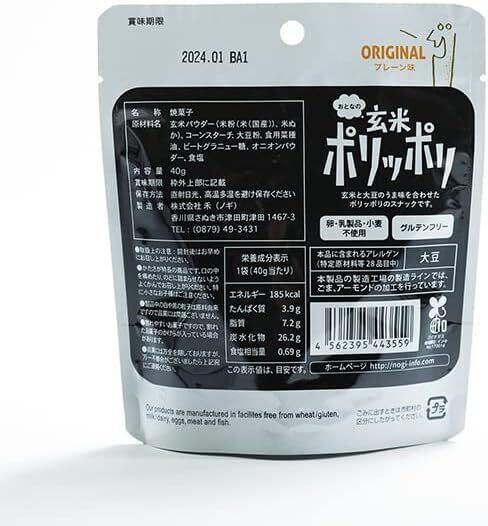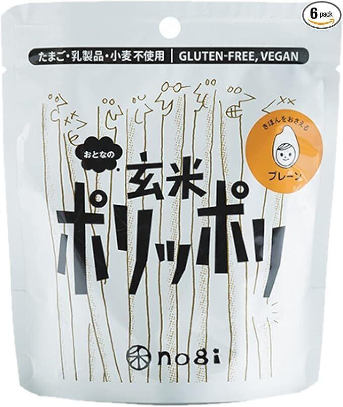 玄米ポリッポリは、国産玄米と大豆粉を使用したグルテンフリースナック。動物性不使用で卵・小麦・乳製品も不使用。ノンフライ製法で罪悪感なく楽しめるポリッとした食感が特徴です。チャック付きで外出先でも手軽に楽しめます。