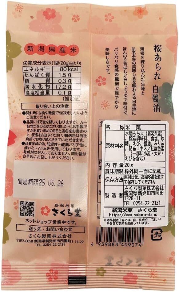 さくら堂の桜あられは、新潟県産もち米「わたぼうし」100%使用の極薄焼きおかき。海老を練り込んだ生地と白生地を白しょうゆで味付けし、パリパリ繊細な食感に仕上げました。合成着色料不使用で、春のおやつやギフトにぴったりです。